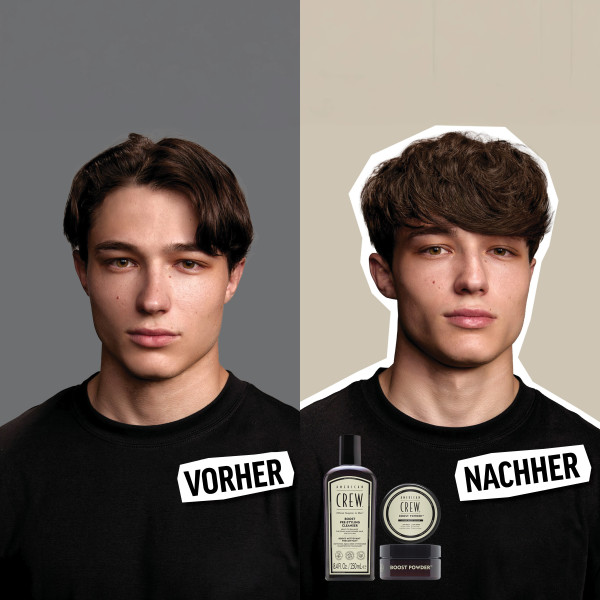 American Crew präsentiert Pre-Styling Shampoos - unsere ersten Shampoos, die Ihr Haarstyling von 80 % auf 100 % bringen. Sie reinigen das Haar und bereiten es auf das Styling vor, damit Ihr Hairstyle sein volles Potenzial entfalten kann. Der Pre-Styling Boost Cleanser ist die ultimative Lösung für Männer, die Volumen und Fülle für ihr Haar wünschen. Die Technologie hinter dem Boost Pre-Styling Shampoo liefert einen reichhaltigen Schaum, der überschüssiges Fett entfernt und gleichzeitig die Feuchtigkeit des Haares bewahrt. Sie hebt die Haarfasern von der Wurzel bis in die Spitzen an und sorgt so für mehr Volumen und Fülle - für schwereloses, volleres Haar, das für das Styling vorbereitet ist. Das Boost Pre-Styling Shampoo reinigt Haar und Kopfhaut gründlich, beruhigt sie und bringt das Mikrobiom der Kopfhaut ins Gleichgewicht. Es eignet sich perfekt feines, dünnes und kraftloses Haar jeder Haarlänge. Entdecken Sie unseren erfrischenden Boost-Duft mit einer Mischung aus Zitrus- und Kräuternoten und einem holzigen Abgang. Einfach auf das nasse Haar auftragen, in das Haar und die Kopfhaut einmassieren, danach ausspülen und bei Bedarf wiederholen. Kombinieren Sie den Pre-Styling Boost Cleanser mit dem leichten, matten Boost Powder für noch mehr Ansatzvolumen und Fülle. Nicht nur reinigen, sondern vorstylen!