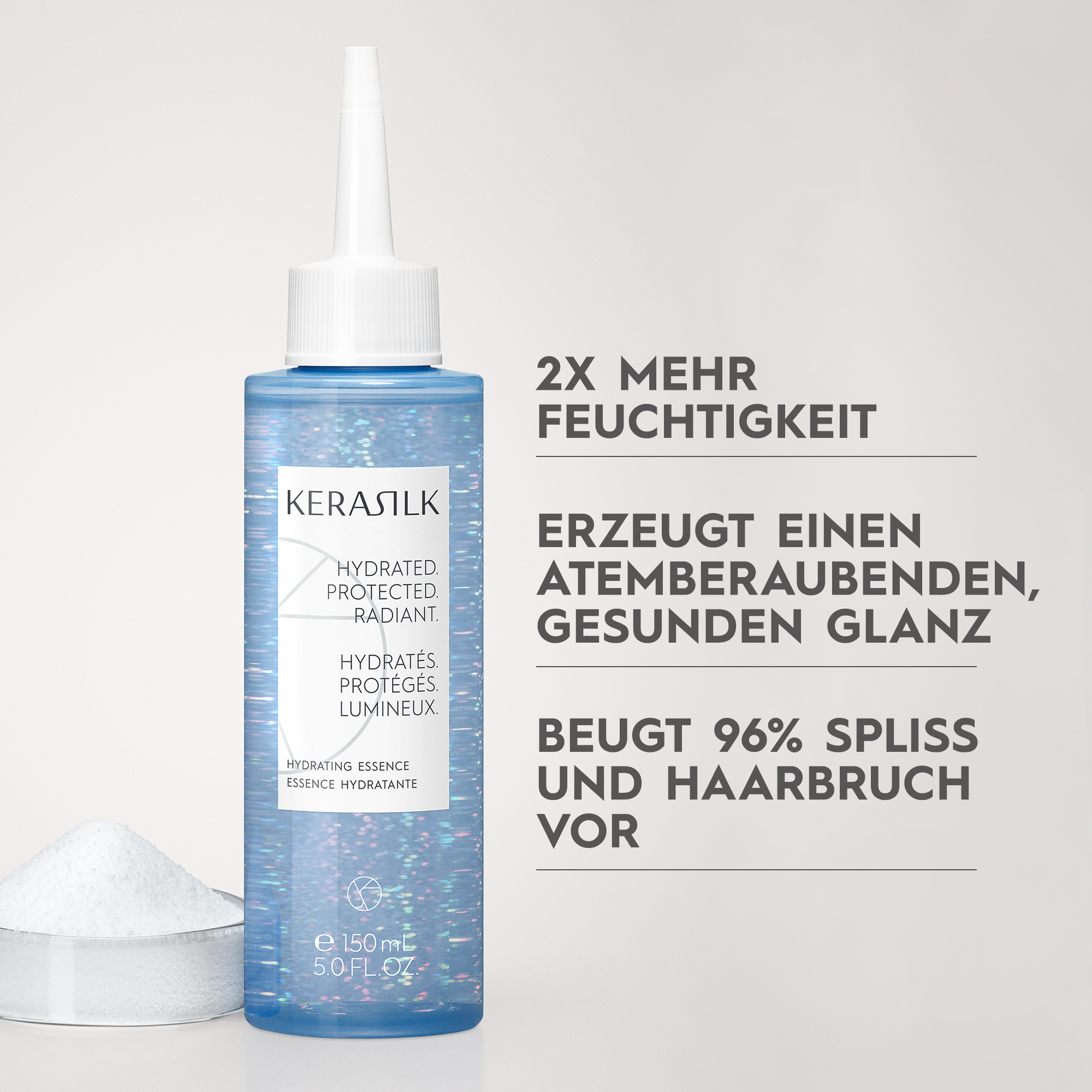 Die schwerelose, hochkonzentrierte Pflege spendet selbst dem trockensten Haar intensive Feuchtigkeit. Es schützt vor Umweltbelastungen, dem Austrocknen und glanzlosem Haar, für einen gesund aussehenden, strahlenden Glanz. Angereichert mit Biomimetic Silk und 4% Betain.