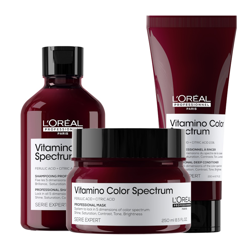 Die Vitamino Color Spectrum Maske von L'Oréal Professionnel wurde speziell für coloriertes Haar entwickelt. Angereichert mit Ferulasäure und Zitronensäure hilft sie, die Farbpigmente im Haar einzuschließen und so die Brillanz in allen 5 Farbdimensionen zu erhalten.*Das Ergebnis:1. Glanz: ultrastarker Glass Shine2. Lebendigkeit: satte Farben3. Kontrast: optimale Tiefe der Farbtöne4. Farbton: keine unerwünschten Reflexe5. Leuchtkraft: helle & dunkle Töne werden belebt. Die Formel mit reichhaltiger, cremiger Textur spendet intensive Feuchtigkeit - für kräftigeres & glatteres Haar.*Instrumenteller Test: nach vierwöchiger Anwendung der vollständigen Vitamino Color Spectrum Routine.- Für mehrdimensionale Farbbrillanz mit Glass Hair Effekt.**- Blondiertes Haar, chemisch behandeltes Haar, coloriertes Haar, glanzloses Haar  **Instrumenteller Test: nach vierwöchiger Anwendung der Vitamino Color Spectrum Routine. Anwendung:Nach der Haarwäsche mit dem Vitamino Color Spectrum Shampoo das nasse Haar in 2 Partien aufteilen. Die Maske gleichmäßig von den Längen bis in die Spitzen verteilen und das Haar mit den Fingern entwirren. 3-5 Minuten einwirken lassen. Gründlich ausspülen. Anschließend das Vitamino Color Spectrum Glass Shine Serum auftragen. Pro-Tipp: Den Deep Conditioner bei jeder Haarwäsche verwenden und diesen einmal pro Woche durch die Maske ersetzen - für die Extraportion Geschmeidigkeit. L'Oréal Professionnel Paris Serie Expert Vitamino Color Spectrum Mask 250ml EAN: 3474637268466