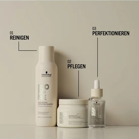 Das BLONDME Bond Repair Nourishing Shampoo mit der BOND REPAIR TECHNOLOGIE reinigt blondes Haar sanft und versorgt es mit Feuchtigkeit. Es stärkt das Haar durch den Aufbau innerer Haarverbindungen und repariert Haarschäden, die zwei Aufhellungsservices entsprechen - bereits nach nur einer Anwendung. Die pflegende Formel angereichert mit Mandelöl und weißem Tee glättet das Haar und verleiht ihm Geschmeidigkeit und einen gesund aussehenden Glanz.