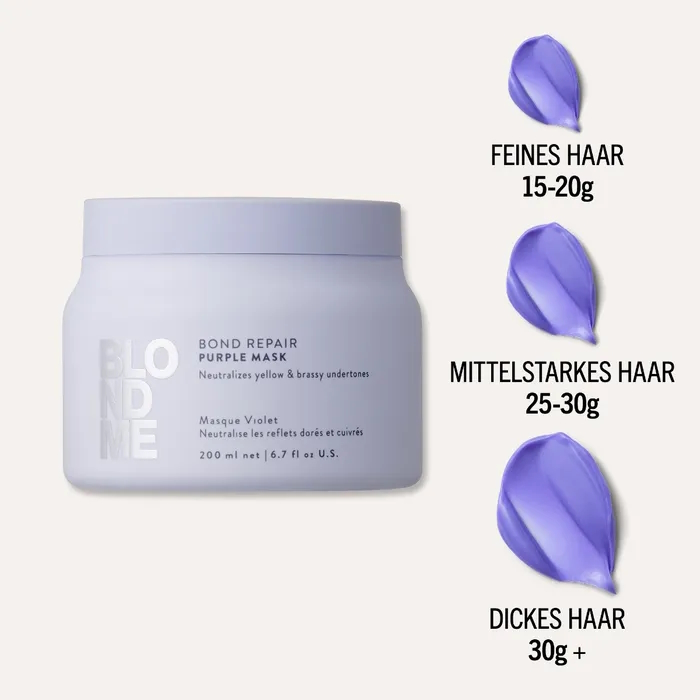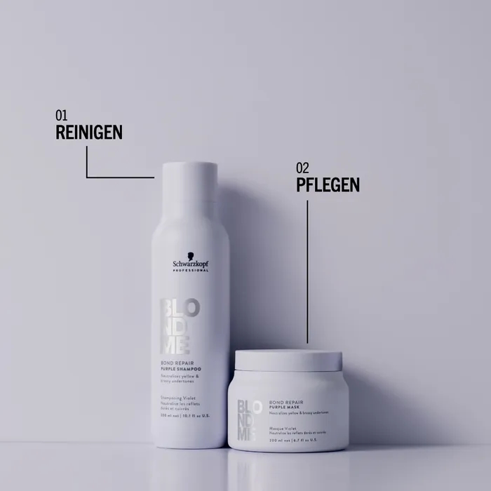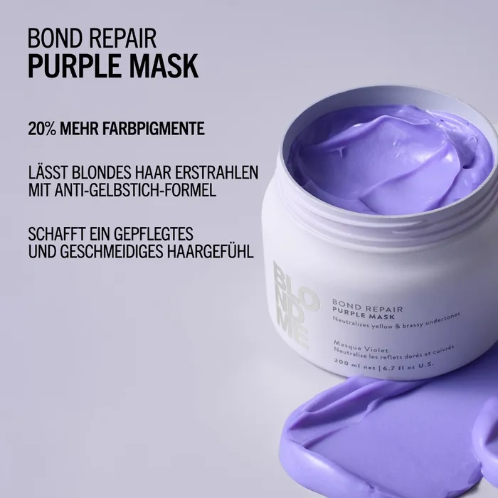 Die BLONDME Bond Repair Purple Mask erfüllt die Bedürfnisse derjenigen, die ihren blonden Look auffrischen und gelbe Untertöne entfernen möchten, während sie gleichzeitig ihr Haar pflegen.