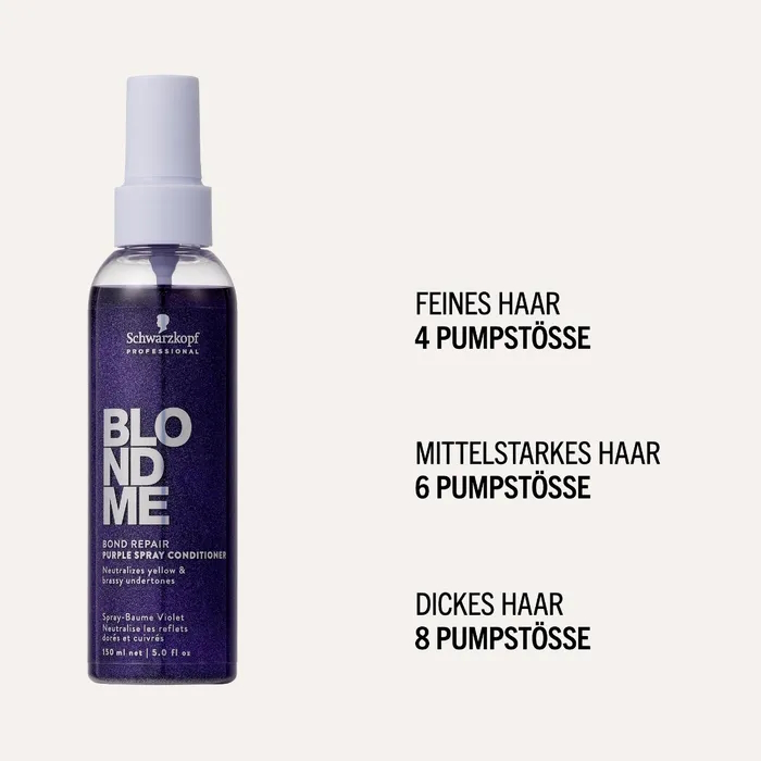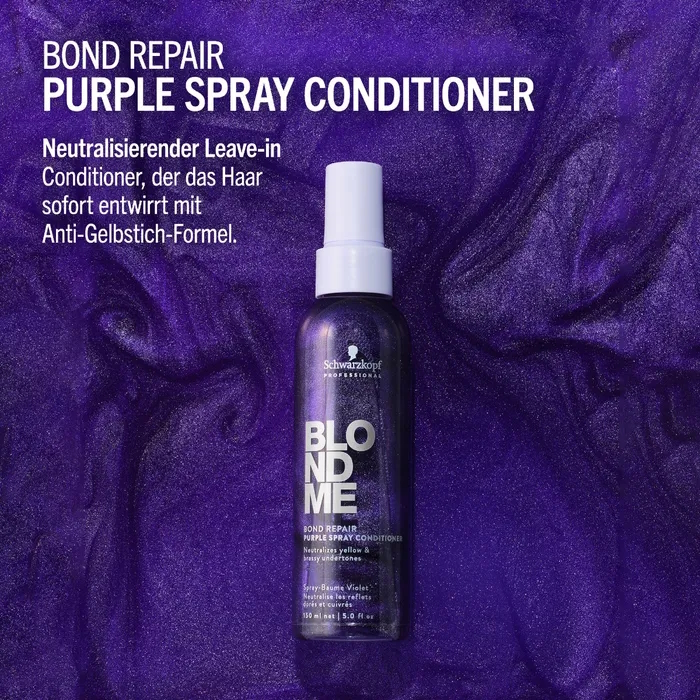 BLONDME Care ist für Kund:innen mit blondem oder aufgehelltem Haar, die ein professionelles Haarpflegeprodukt benötigen, das ihr Haar schützt und stärkt. Der BLONDME Bond Repair Purple Spray Conditioner ist für Kund:innen, die ihren blonden Look auffrischen und gelbe Untertöne entfernen möchten, während sie gleichzeitig ihr Haar pflegen.