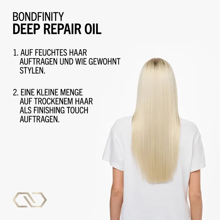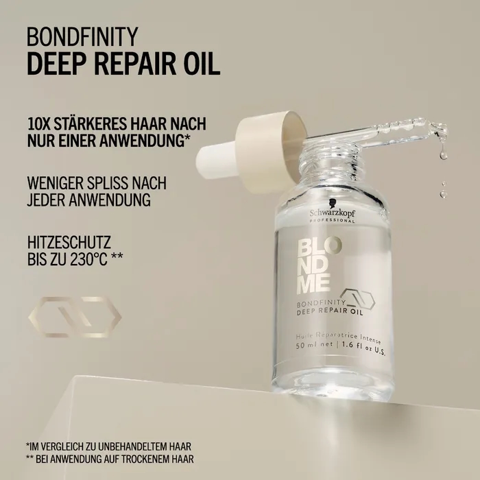 Das BLONDME Deep Repair Oil mit der BONDFINITY TECHNOLOGIE repariert und stärkt blondes und aufgehelltes Haar tiefgreifend, ohne es zu beschweren. Sie stellt die Gesundheit des Haares wieder her, indem sie dauerhafte Haarverbindungen schafft und das haareigene Keratin einschließt - eine proaktive, dauerhafte Reparatur für das Haar, das nach nur einer Anwendung 7-malstärker ist*. Außerdem glättet es poröses Haar für schönen Glanz, bietet 24 Stunden Frizz-Kontrolle und schützt es mit einem Hitzeschutz von 230°C vor Stylingschäden.