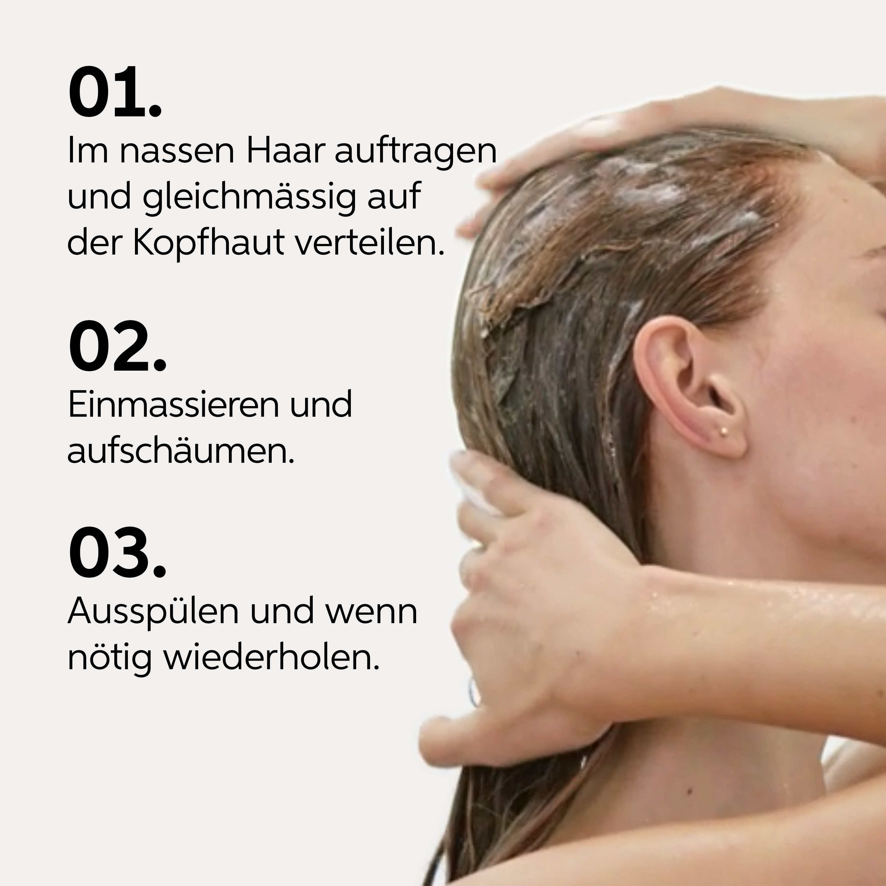 Ins feuchte Haar geben und aufschäumen. Gründlich ausspülen.
